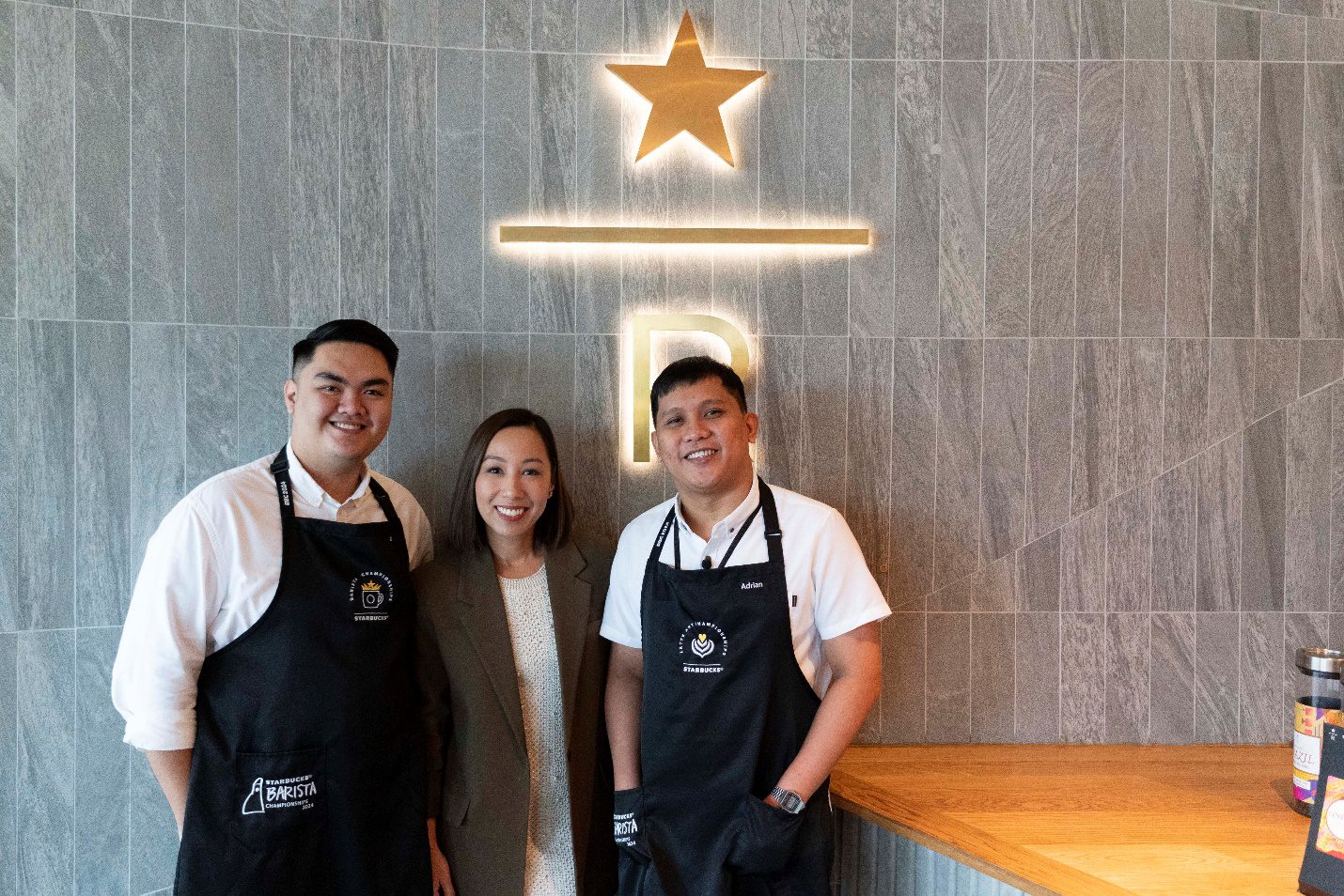 L-R: Kent Dela Cruz, 2024 Starbucks Philippines Barista Champion, Jamie Silva, senior manager of Marketing, DCE & Loyalty, Starbucks Philippines, Adrian Santos, 2023 Starbucks Philippines Latte Art Champion