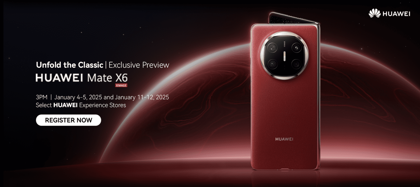 HUAWEI will offer an exclusive VIP experience for the HUAWEI Mate X6 at 35 select HUAWEI Experience Stores from January 11 to 12 at 3:00PM. Discover the HUAWEI Mate X6 and the HUAWEI nova 13 Series at select HUAWEI Experience Stores on January 18 to 19 at 3:00PM and on January 25 to 26 at 3:00PM.