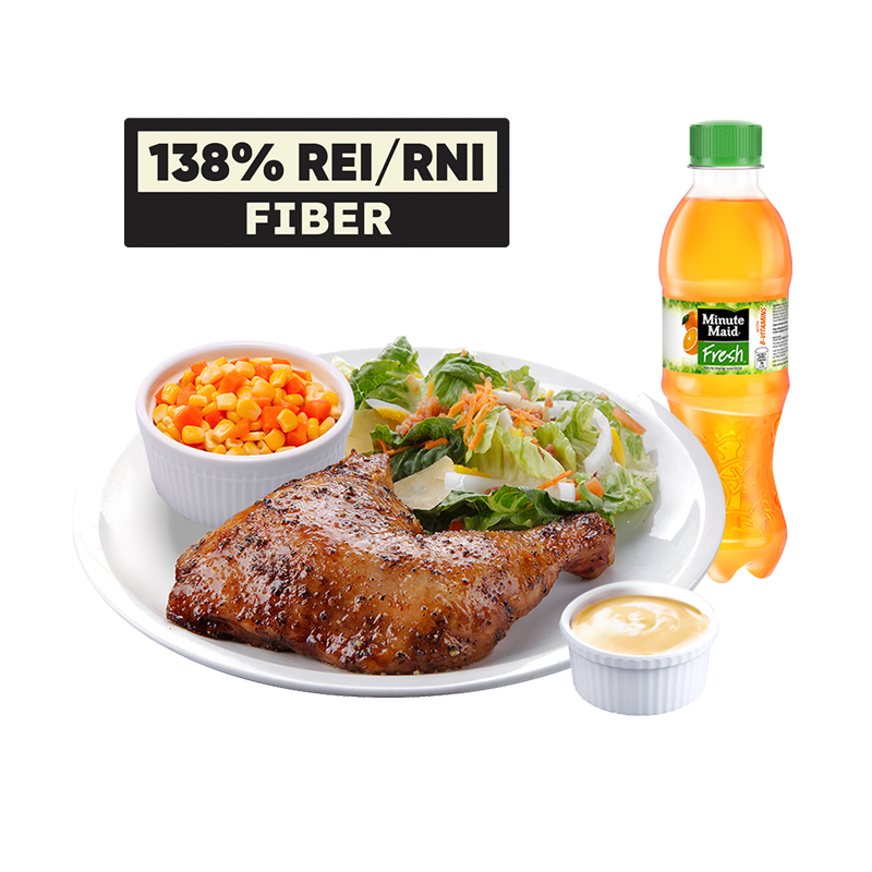 •High Fiber Meal with roasted chicken, corn and carrots, caesar salad, and a drink. It offers 35g of dietary fiber, giving you 138% fiber for the day to support healthy digestion and longer lasting fullness.