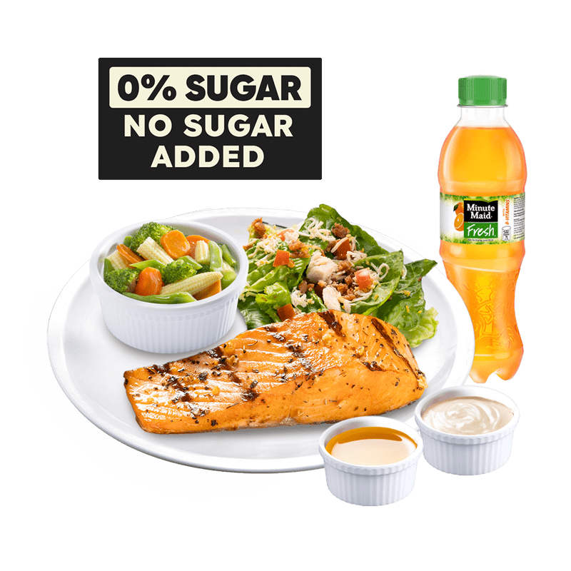 •Low Sugar Meal with grilled salmon, lemon butter sauce, steamed vegetables, Cobb salad with ranch dressing, and a drink. With zero grams of sugar, it supports balanced energy without spikes.
